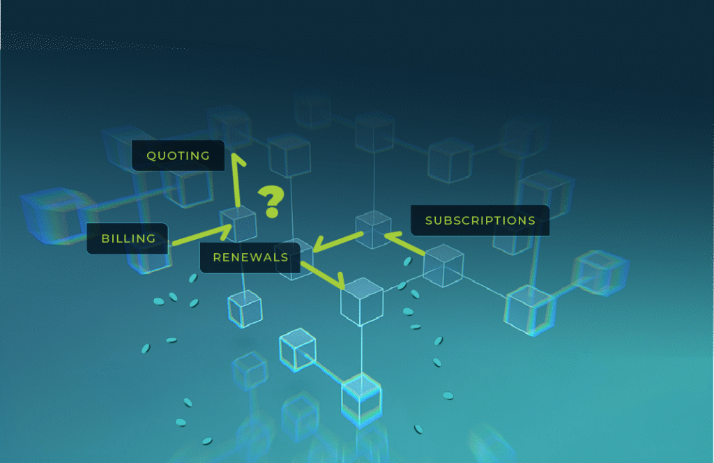 First, different departments use separate tools for commerce, payments, quoting, subscriptions, billing, invoicing, renewals, and revenue recognition. Each tool operates independently, making it hard to standardize processes and share actionable data.